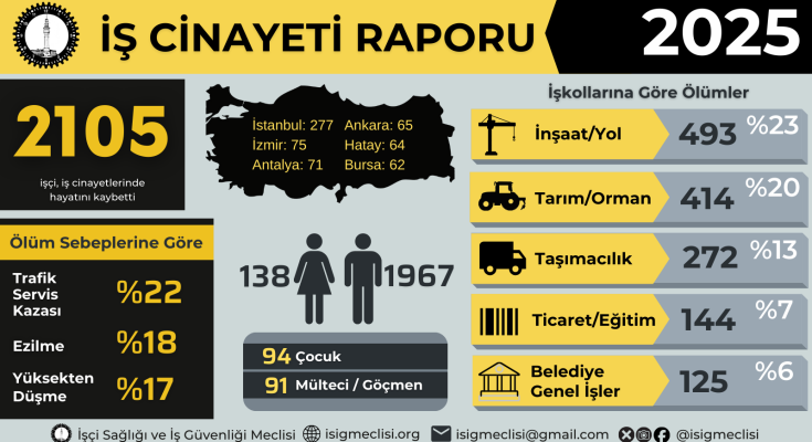 Türkiye’de 2025 yılı, işçi sınıfı açısından bir kez daha ölümle, güvencesizlikle ve cezasızlıkla anılan bir yıl oldu. İSİG Meclisi raporuna göre, 2025 yılında en az 2.105 işçi iş cinayetlerinde yaşamını yitirdi.