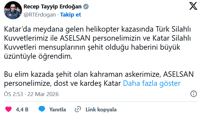 “Katar’da meydana gelen helikopter kazasında Türk Silahlı Kuvvetlerimiz ile ASELSAN personelimizin ve Katar Silahlı Kuvvetleri mensuplarının şehit olduğu haberini büyük üzüntüyle öğrendim. Bu elim kazada şehit olan kahraman askerimize, ASELSAN personelimize, dost ve kardeş Katar askerlerine Allah’tan rahmet niyaz ediyor; ailelerine başsağlığı dileklerimi iletiyorum. Ülkemizin, milletimizin ve Katar halkının başı sağ olsun.”