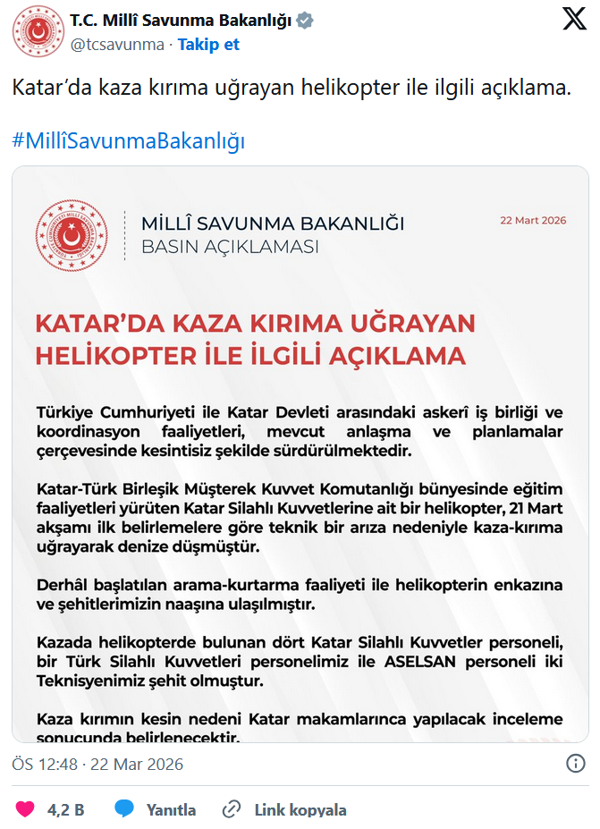 “Türkiye Cumhuriyeti ile Katar Devleti arasındaki askerî iş birliği ve koordinasyon faaliyetleri, mevcut anlaşma ve planlamalar çerçevesinde kesintisiz şekilde sürdürülmektedir. Katar-Türk Birleşik Müşterek Kuvvet Komutanlığı bünyesinde eğitim faaliyetleri yürüten Katar Silahlı Kuvvetlerine ait bir helikopter, 21 Mart akşamı ilk belirlemelere göre teknik bir arıza nedeniyle kaza-kırıma uğrayarak denize düştü. Kazada helikopterde bulunan dört Katar Silahlı Kuvvetler personeli, bir Türk Silahlı Kuvvetleri personelimiz ile ASELSAN personeli iki teknisyenimiz şehit olmuştur.”